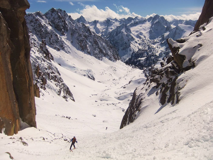 Pero aún quedaba un mes por delante y muchas cosas por hacer. Tocó calzarse los esquís unas cuantas veces más y pude disfrutar de días por Benasque y pegarnos el bajadón del Aneto. También la Bonaigua o Amitges con un “paquete” de nieve más propio de febrero en un buen invierno, así como un par de salidas por Picos de Europa en los días previos de preparativos al viaje a Marruecos. Y es que casi con un pie en el continente vecino, ¡había que ponerse las pilas para sacar partido a la roca africana! Finalmente compaginaba el descanso de la piel de los dedos de escalar subido en los esquís y las pesadas piernas de foquear a base de desplomes.