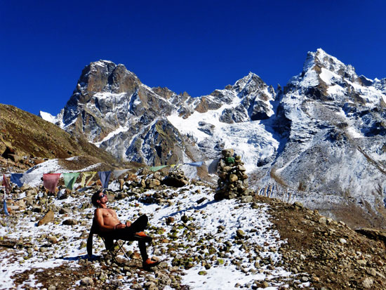 Íbamos con intención de escalar caras nortes y hacer alpinismo en un cordal virgen de la zona del Sigrila, de 6.200 metros, pero la méteo no ha sido buena y había una descomunal cantidad de nieve acumulada. Así que fuimos variando y buscando caras sur.