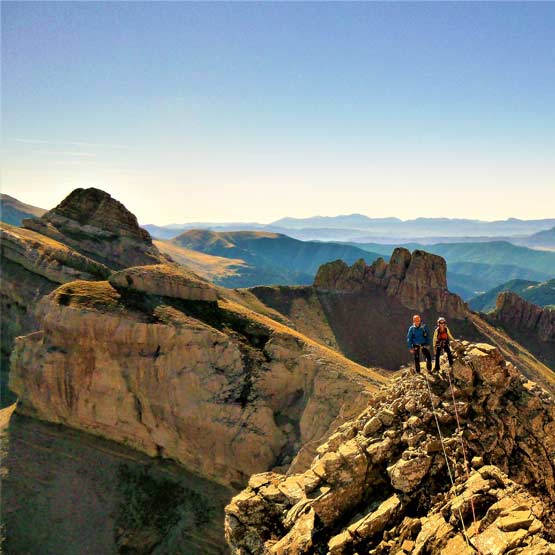 La arista SO o de Tres Consejeros se ha convertido en una de las grandes clásicas del Pirineo en su dificultad. Buena calidad de roca y belleza imponen que así sea.
